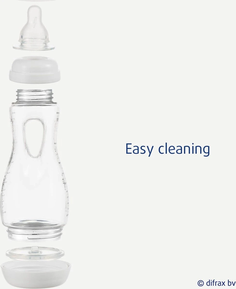 In de bodem van de handgreepfles zit een uniek Anti-colic ventiel. Dit voorkomt vacuüm zuigen en vermindert de kans op boeren, spugen en darmkrampjes. De flessenspeen heeft een zachte afwerking. Door de afschroefbare bodem is de babyfles makkelijk schoon te maken. Ontwikkeld door Difrax medisch team.