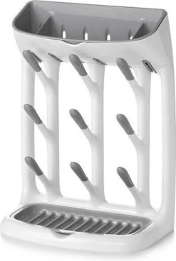 Het ruimtebesparende flessen droogrek heeft een compact ontwerp dat veel indruk maakt, en biedt plaats aan drink bekers, baby flesjes en al hun onderdelen zonder dat het aanrecht vol komt te staan. De schuine knijpers houden bekers en flessen in precies de juiste hoek om ze grondig te drogen, terwijl de bovenkant en de bodem perfect zijn voor het drogen van kleine onderdelen zoals ventielen, of zelfs fopspenen. Het droogrek of flessenrek past netjes onder kasten, zodat het uit de weg kan worden gestoken tegen de muur. Het onderste gedeelte heeft ribbels om deksels en meer omhoog te houden voor snel drogen, en zowel het onderste- als de bovenste gedeelte zijn uitneembaar voor grondig schoonmaken.